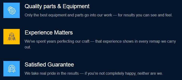 • All software is developed to work on a standard vehicle, maintaining manufacturer levels of reliability and original service intervals. We will not overstate our figures to appear better than our competitors.