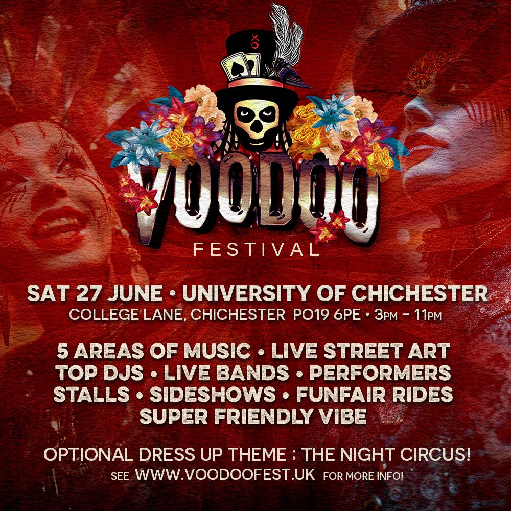 In it’s NEW venue at Bishop Otter Campus, Chichester University and now in it’s 3rd year, Voodoo is a unique, boutique music & street art festival celebrating dance music heritage on the south coast, with a Main Stage, brand new LIVE BANDS stage for 2026, plus 3 more areas of a diverse range of music – live street art by some of the UK’s top street artists – and loads more.
